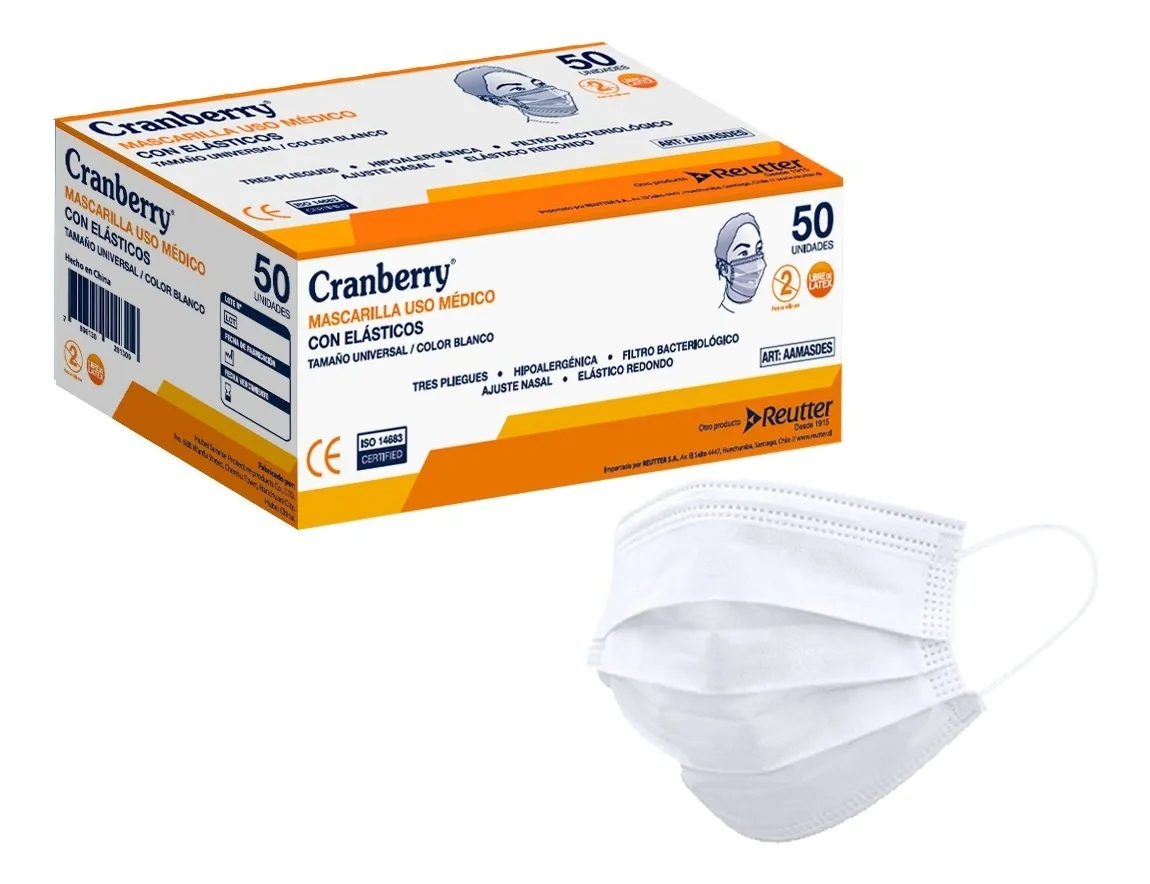 Las Mascarillas Cranberry de 3 Capas (Tipo IIR) son dispositivos de uso quirúrgico diseñados para ofrecer una protección eficaz contra virus y bacterias. Poseen una Eficiencia de Filtración Bacteriológica y Viral (BFE) superior al 98%. Su diseño de tres pliegues incluye una capa externa, un filtro central y una capa interna para mayor comodidad. El clip nasal flexible (10 cm) asegura un ajuste seguro y confortable.